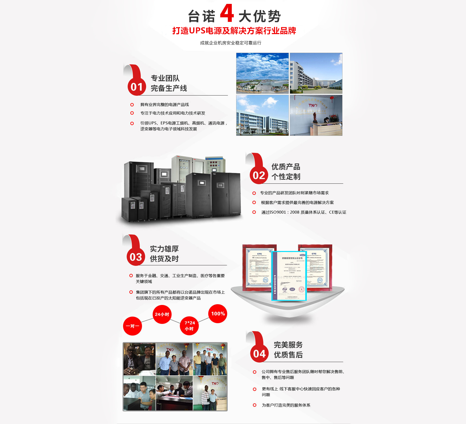 東莞市臺(tái)諾電子有限公司是一家以新能源、UPS不間斷電源、EPS應(yīng)急電源、交直流穩(wěn)壓電源、鉛酸免維護(hù)蓄電池、智能變頻電源、智能開關(guān)電源、智能一體化逆變電源、智能電源監(jiān)控系統(tǒng)的研究、開發(fā)、生產(chǎn)、經(jīng)營(yíng)、銷售及技術(shù)推廣等多行業(yè)發(fā)展高新企業(yè)。公司位于東莞市毗鄰中國(guó)南方經(jīng)濟(jì)重地廣州、深圳,交通發(fā)達(dá),信息暢通。系廣東重點(diǎn)高新技術(shù)企業(yè)、東莞市創(chuàng)新型企業(yè)、也是中國(guó)電源協(xié)會(huì)、廣東省材料與器件產(chǎn)業(yè)技術(shù)創(chuàng)新戰(zhàn)略聯(lián)盟、 東莞市臺(tái)諾電子有限公司隸屬于臺(tái)諾集團(tuán),是一家有多年UPS集設(shè)計(jì)研發(fā)、生產(chǎn)銷售、售后服務(wù)為一體的公司,擁有業(yè)界完整的電源產(chǎn)品線,專注于電力技術(shù)應(yīng)用和電力技術(shù)研發(fā)。公司致力于向全球客戶提供性能好、品質(zhì)好的產(chǎn)品與服務(wù)。UPS、EPS電源工頻機(jī)、高頻機(jī)、通訊電源、光伏、逆變器等電力電子領(lǐng)域科技發(fā)展,創(chuàng)造可靠、節(jié)能的產(chǎn)品,致力于為客戶提供完善的電源解決方案。產(chǎn)品廣泛應(yīng)用于政府、金融、通信、教育、交通、氣象、廣播電視、工商...